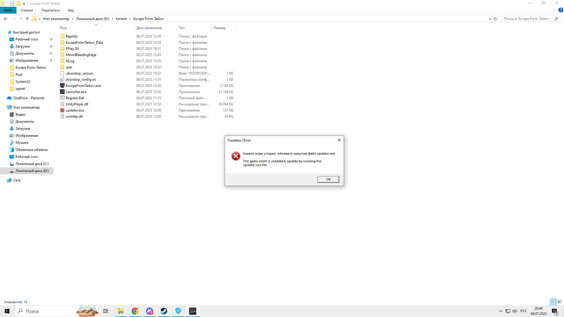 Зайдите в папку с игрой и запусти updater.exe , он обновит игру до актуальной версии и вы сможете её запустить.