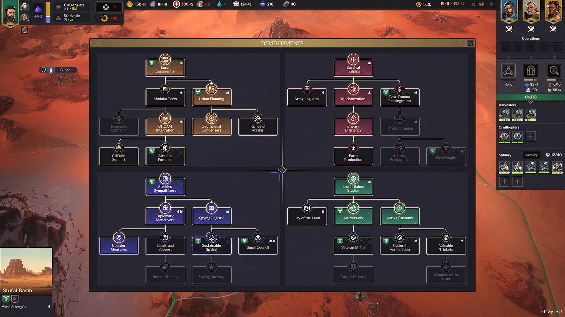 Dune Spice Wars – стратегический игровой проект, где все действия будут происходить в режиме реального времени, а нам предстоит с головой окунуться в атмосферу вселенной «Дюна». Ты исполнишь роль главного героя, который является главнокомандующим одной из фракций, являющейся участником сопротивлений с другими фракциями за власть над пустыней. Тебе необходимо подключить навыки быстродействия, смекалку, а также продумать правильный стратегический план, который поможет быстрее и эффективнее добиться желаемого.